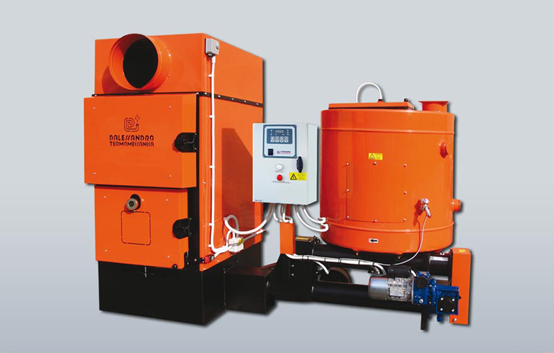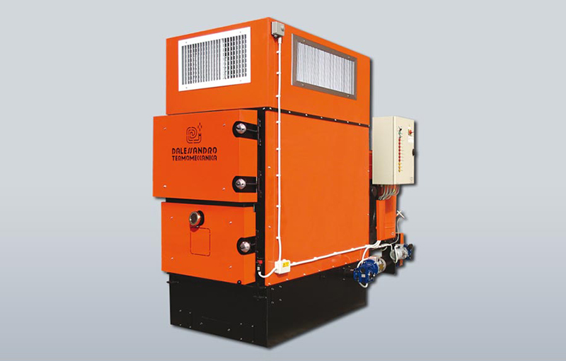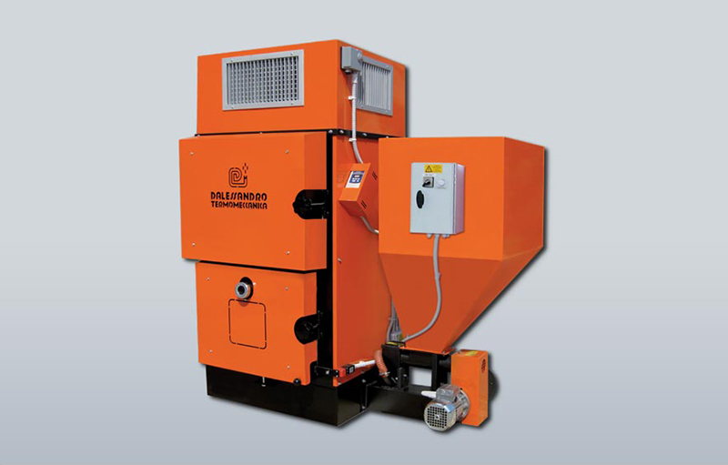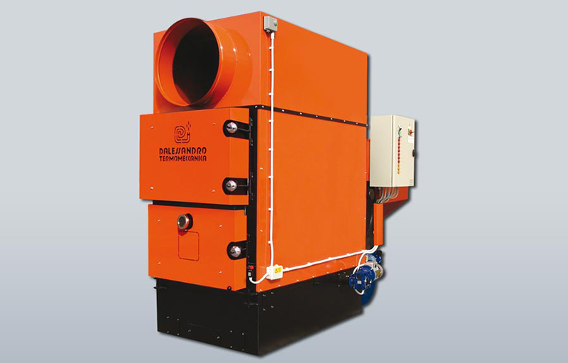 Generador d'aire calent amb tres passos de fum. Cos del generador i tubs d'acer. Superfícies exposades a altes temperatures en acer inoxidable. Porta aïllant per a la inspecció i el manteniment de la caldera. Cremador de ferro colat dotat d'un vis sens fi mecànic. Tremuja per a la càrrega del combustible. Regulació del combustible a través del servomotor. Sistema d'aire primari i secundari. Plènum amb aletes de difusió per a la connexió a un tub d'aire. Ventilador centrífug per a la difusió d'aire calent.